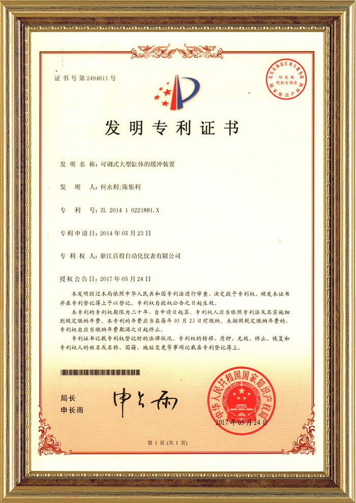 液控大缸體緩沖發明專利證書