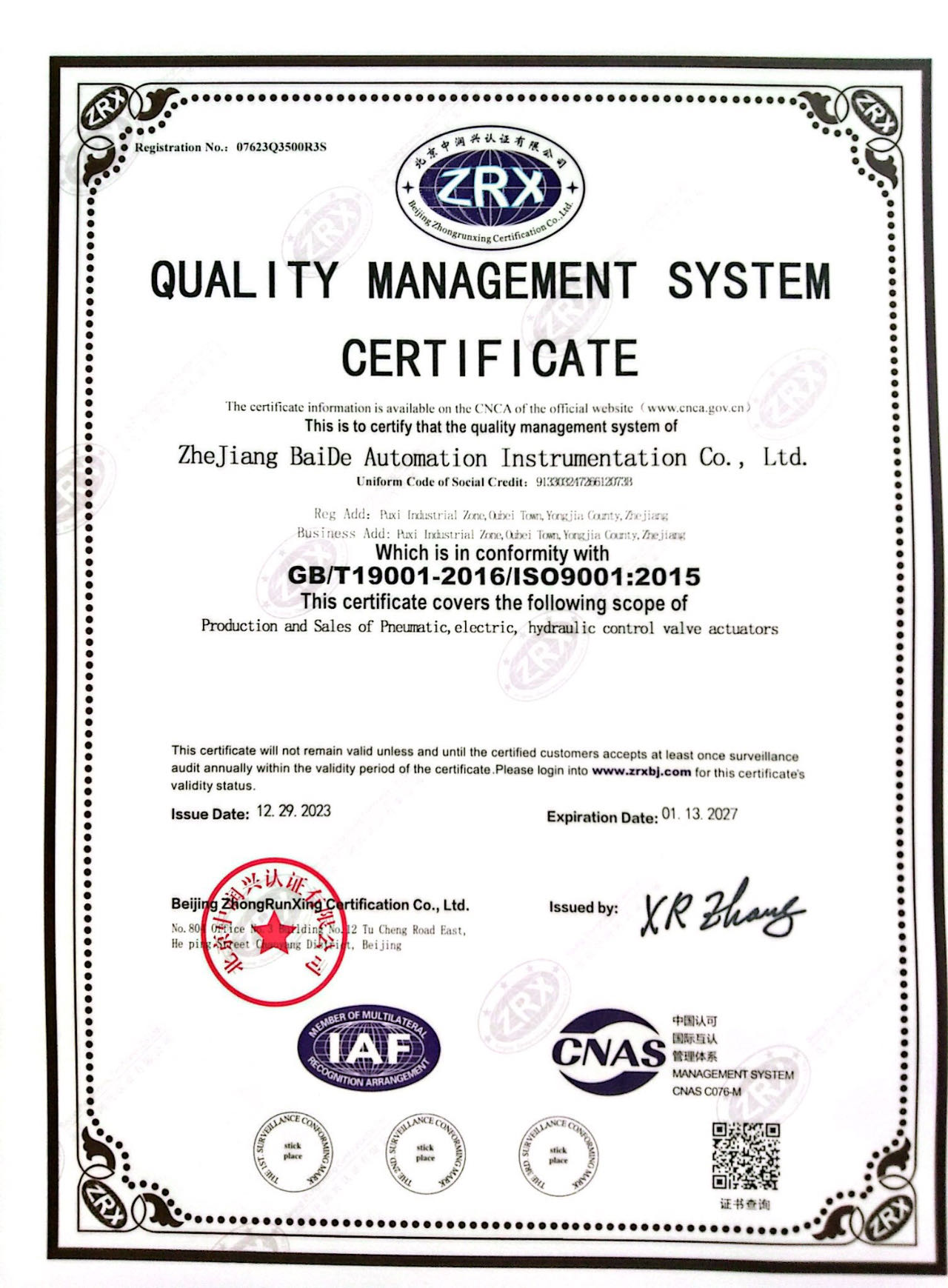 質(zhì)量管理體系認證證書中文版